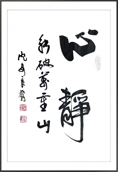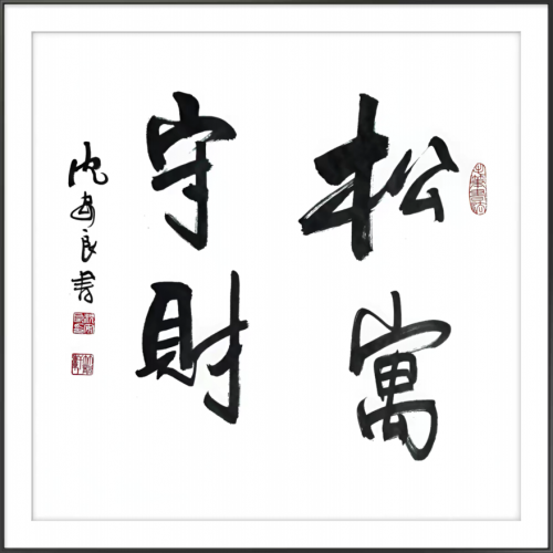 他的竹笔,无楞无角,无毫无锋,拿在手里挥洒自如,纵横驰骋之处,墨迹浓淡相宜,笔画粗细匀称,线条疏密和谐,不仅有甲骨金石之古拙,张旭草书之豪雄,更溢散着强烈的现代意识。作品笔画大小无论长短,都“三过其笔”,用笔形态清晰可见,起笔、行笔、收笔交待清晰,且细腻多变,从而把笔画的“俯仰向背”之势充分的表达出来,牵动着受众的心理。沈安良用笔灵活,笔法丰富,起笔处主要以侧入平铺为主,善用切锋,但切的角度不同,同时又有方笔、圆笔的配合使用,整幅作品在灵动简洁的同时,又多了含蓄蕴藉之感,行笔以中锋为主,巧妙的加入侧锋,中侧锋结合,善用提按之法,线条丰富,使转以圆笔为主,辅以方笔,方圆结合,书法刚柔并济。运笔速度富有韵律,节奏感强,收笔动作交待消晰,使其书法笔断意连,气息通畅。他以墨求韵,与王羲之的魏晋风韵所追求的温和、娴雅、润色相间的墨法表现是一脉相承的。其墨法受王羲之书风的影响呈现出一种“中和"的色彩来,作品中墨色的枯、湿、浓、淡、焦可以体现作品的精神气韵,墨色的丰富变化使作品的虚实、远近对比更加鲜明,从而更好地体现神韵。书法作品中铁划银钩的《松挺势雄》,气势磅礴,苍劲雄健,有搏风击雨的风骨;形神和谐的《寿》,古拙凝重,豁达潇洒,有虚怀若谷的神韵;笔吐其志,飘逸灵动的《雄鸡声远》,缠绵悱恻,如丝如缕,绕人情怀,厚重端庄的《善行天下》,落落大方,无拘无束。更有那竹笔所写之《竹》,矗立峰巅,枝枝倔强,节节刚毅,展示着沈安良的品性气节;那占据满幅白纸的《猛虎雄风》,线条飞扬,叫人观之心动。沈安良匠心独运,其笔下的线,险峻时如高峰耸起,幽雅处似石缝涌泉,轻细的若柳丝飘拂,粗狂的像松涛呼啸。柔中有刚,线断气连;刚中有柔,韵味萦绕。